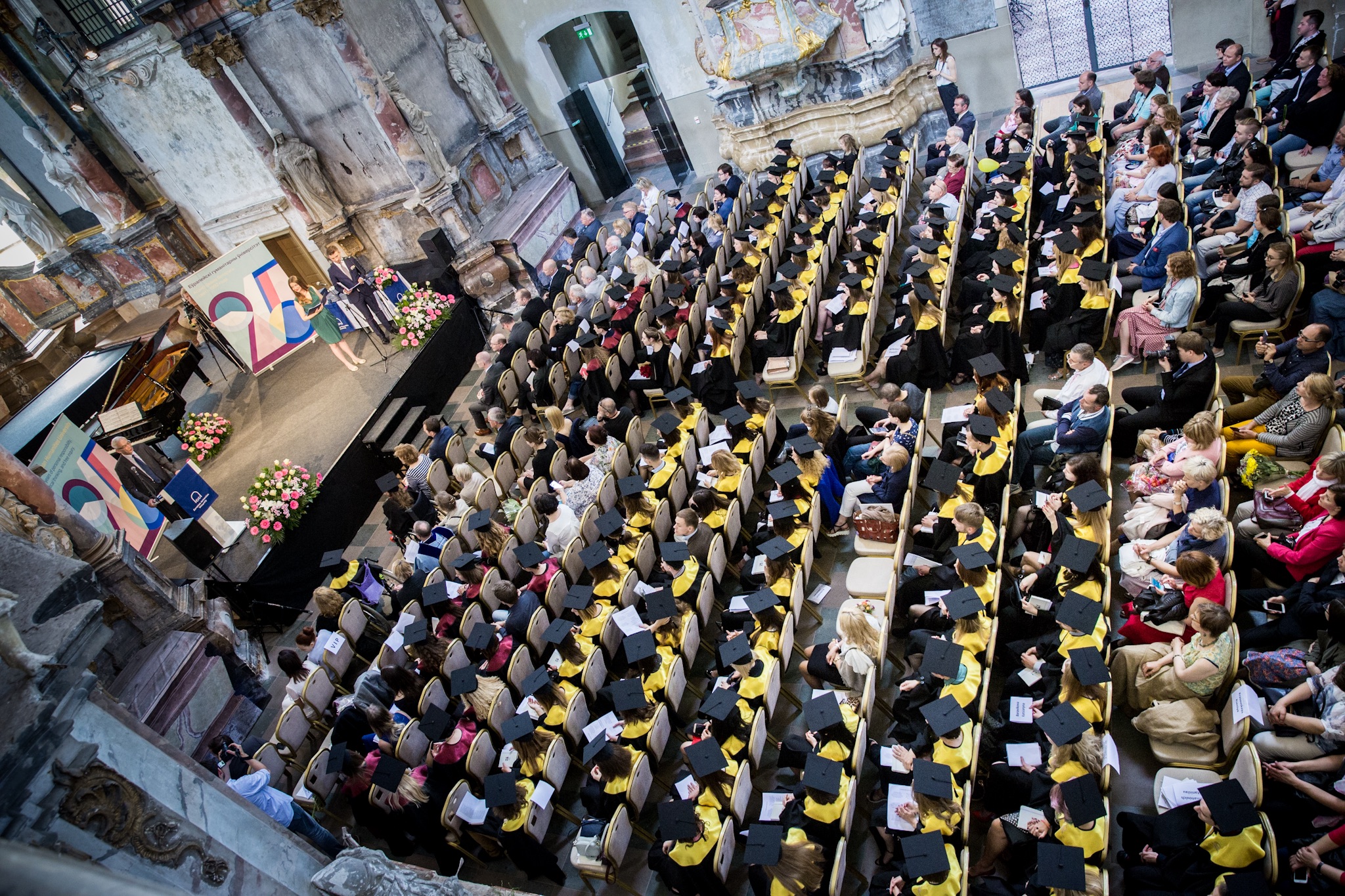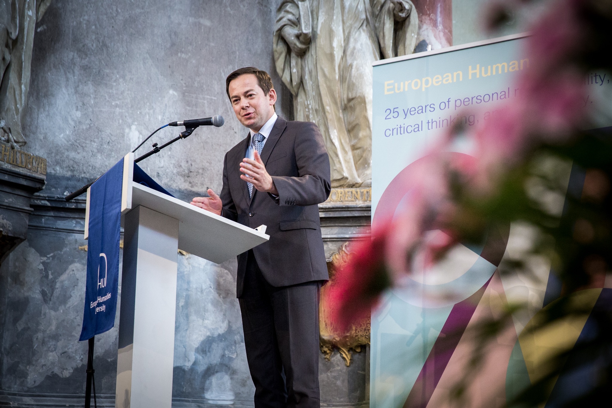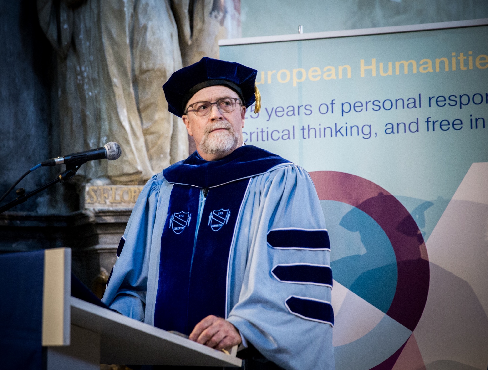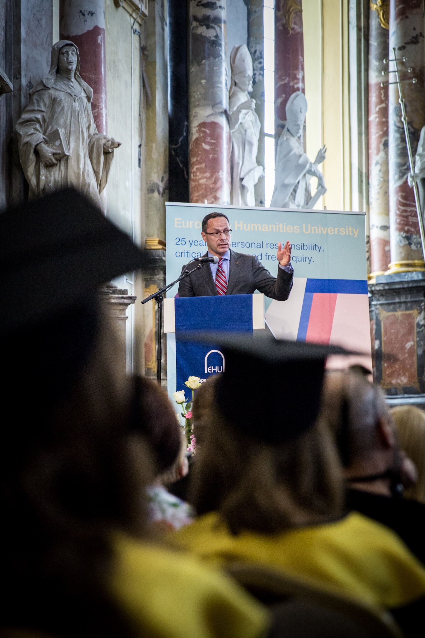 З прывітальным зваротам да выпускнікоў ЕГУ звярнуўся кіраўнік Прадстаўніцтва Еўрапейскай камісіі ў Літве Арнольдас Пранцкявічус: «З’яўляючыся буйнейшым донарам ЕГУ, Еўрапейская камісія заўсёды лічыла, што дапамога ўніверсітэту – гэта вельмі значная інвестыцыя ў акадэмічныя вольнасці і асабістую свабоду. У сённяшнім свеце, дзе пануюць сумнеў і альтэрнатыўныя факты, менавіта крытычнае мысленне і рацыянальны розум становяцца надзвычай істотнымі. Мы, вольныя грамадзяне, мусім заняць актыўную грамадзянскую пазіцыю, прыняць адказнасць за сваю краіну, Еўропу і сусветную супольнасць. Магчымасць быць такімі – вось галоўны падарунак, якім надзяліў вас ЕГУ».