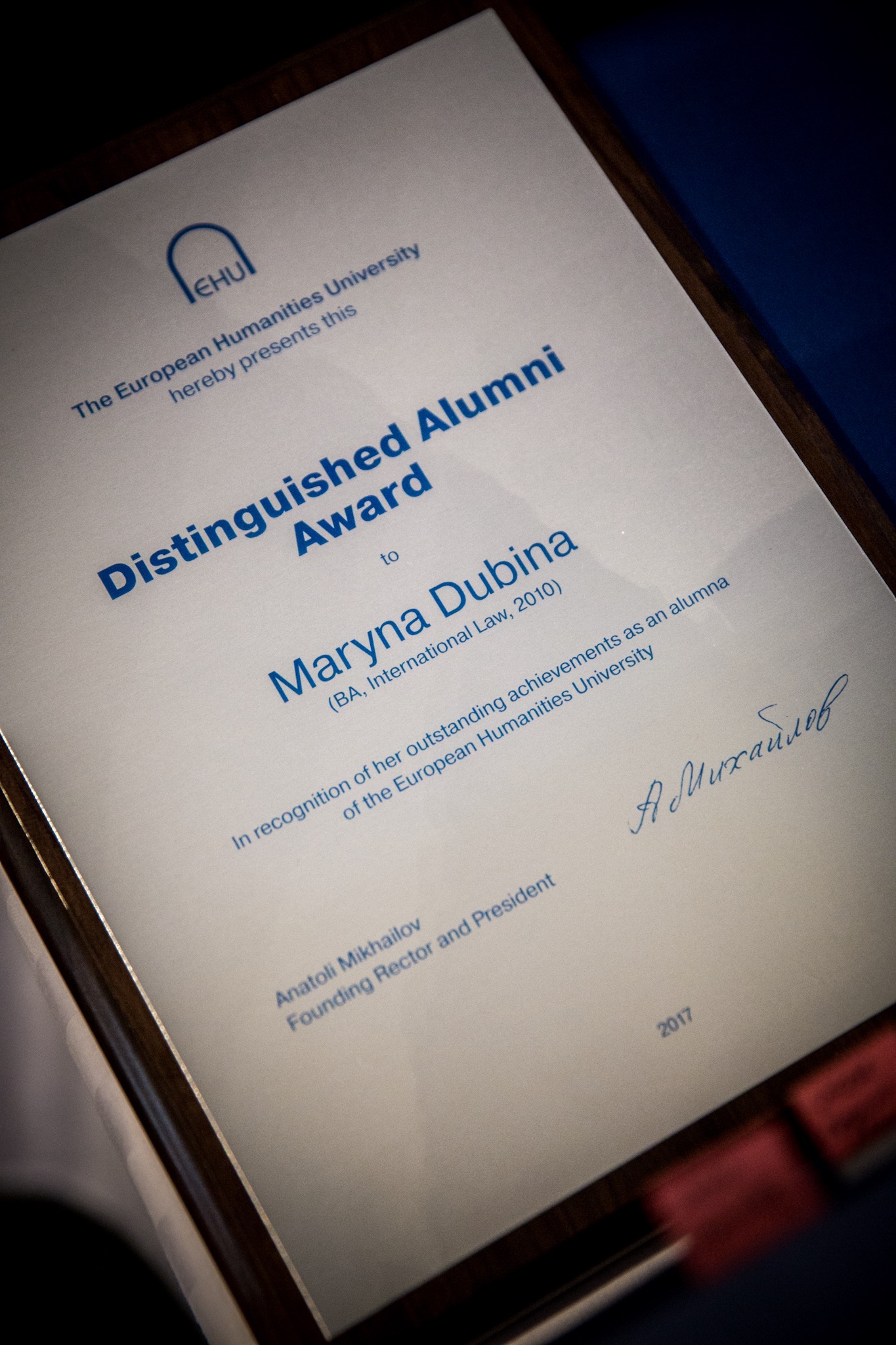 Падчас цырымоніі адбылося ўручэнне ўжо пятай узнагароды «Выбітнаму выпускніку ЕГУ-2017», якім у гэтым годзе стала выпускніца праграмы «Міжнароднае права» 2010 года Марына Дубіна. Выпускніца займае пасаду каардынатаркі прававой службы беларускага сяброўства «Зялёная сетка» і дырэктаркі Грамадзянскага аб’яднання «Экадом».