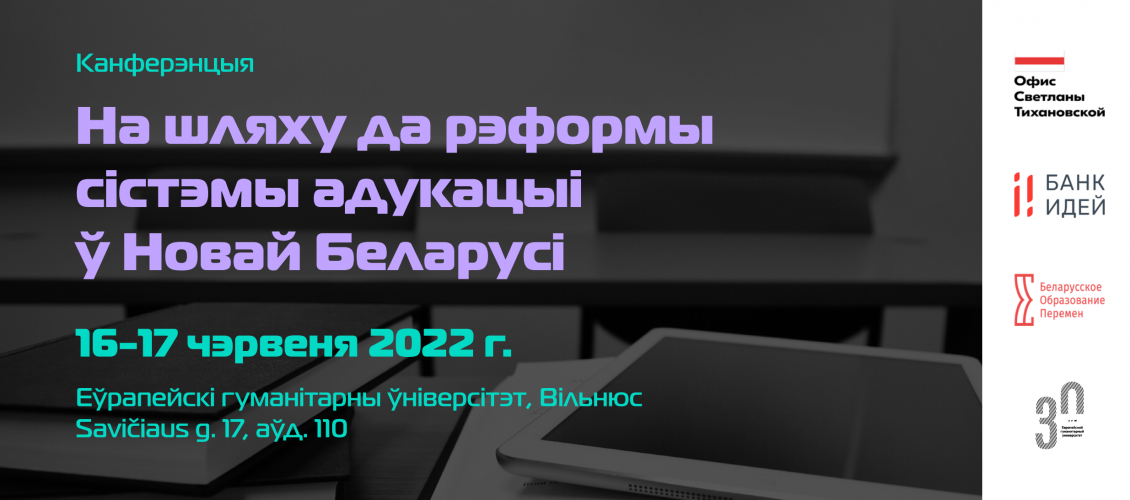 16–17 чэрвеня Еўрапейскі гуманітарны ўніверсітэт запрашае ўсіх жадаючых прыняць удзел у канферэнцыі «На шляху да рэформы сістэмы адукацыі ў Новай Беларусі», якая пройдзе ў 110 аўд. універсітэта па адрасе Savičiaus g. 17. Для ўдзелу ў мерапрыемстве неабходна зарэгістравацца па спасылцы.
